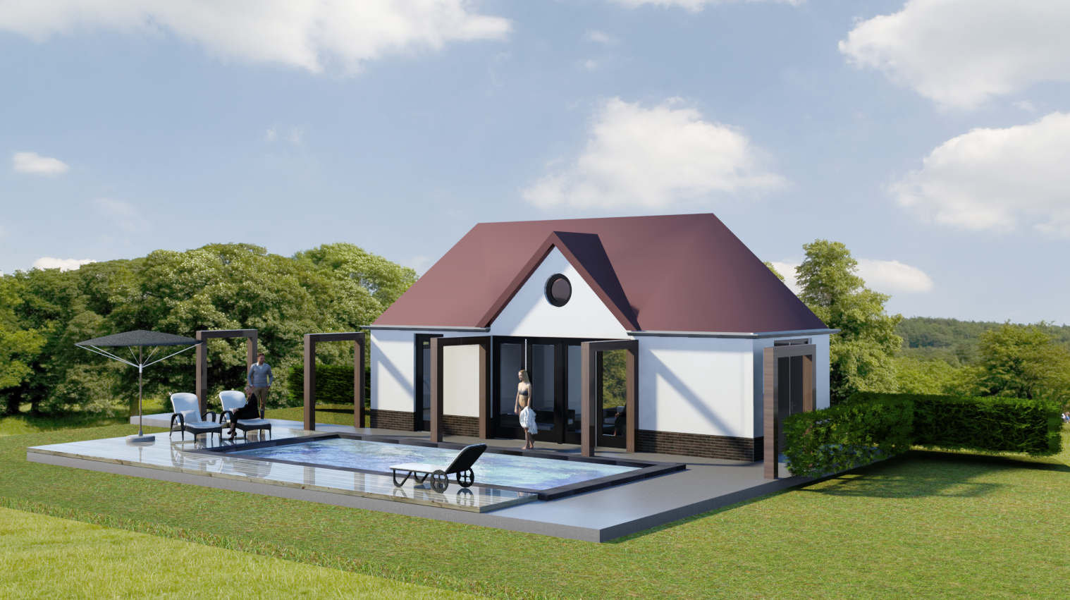Het poolhouse wordt helemaal geprefabriceerd en als een houten bouwpakket aangeleverd.